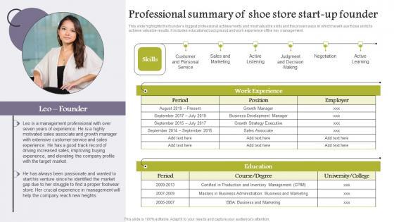 This slide highlights the founders biggest professional achievements and most valuable skills and the proven ways in which he will use those skills to achieve valuable results. It includes educational background and work experience of the key management. Find a pre designed and impeccable Company Analysis Of Shoe Store Professional Summary Shoe Store Demonstration Pdf. The templates can ace your presentation without additional effort. You can download these easy to edit presentation templates to make your presentation stand out from others. So, what are you waiting for Download the template from Slidegeeks today and give a unique touch to your presentation. This slide highlights the founders biggest professional achievements and most valuable skills and the proven ways in which he will use those skills to achieve valuable results. It includes educational background and work experience of the key management.