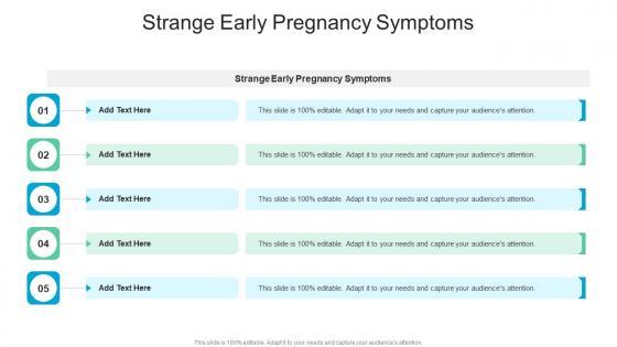 Introducing our well designed Strange Early Pregnancy Symptoms In Powerpoint And Google Slides Cpb This PowerPoint design presents information on topics like Strange Early Pregnancy Symptoms As it is predesigned it helps boost your confidence level. It also makes you a better presenter because of its high quality content and graphics. This PPT layout can be downloaded and used in different formats like PDF, PNG, and JPG. Not only this, it is available in both Standard Screen and Widescreen aspect ratios for your convenience. Therefore, click on the download button now to persuade and impress your audience. Our Strange Early Pregnancy Symptoms In Powerpoint And Google Slides Cpb are topically designed to provide an attractive backdrop to any subject. Use them to look like a presentation pro.