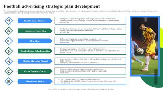 The following slide highlights target audience, understand competition, clear goals, Unique value proposition, marketing channels, engaging content, measure and analyze to show football marketing strategic plan development. It helps organizations to create a comprehensive football marketing strategy. Showcasing this set of slides titled Football Advertising Strategic Plan Development Clipart Pdf The topics addressed in these templates are Identify Target Audience, Understand Competition All the content presented in this PPT design is completely editable. Download it and make adjustments in color, background, font etc. as per your unique business setting. The following slide highlights target audience, understand competition, clear goals, Unique value proposition, marketing channels, engaging content, measure and analyze to show football marketing strategic plan development. It helps organizations to create a comprehensive football marketing strategy.
