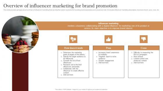 This slide provides glimpse about summary of influencer marketing that can help the bakery business for boosting brand awareness and conversion rate. It includes influencer marketing description, how does it work, pros, cons, etc.This modern and well arranged Overview Of Influencer Marketing For Brand Strategic Advertising Plan For Bakehouse Demonstration Pdf provides lots of creative possibilities. It is very simple to customize and edit with the Powerpoint Software. Just drag and drop your pictures into the shapes. All facets of this template can be edited with Powerpoint no extra software is necessary. Add your own material, put your images in the places assigned for them, adjust the colors, and then you can show your slides to the world, with an animated slide included. This slide provides glimpse about summary of influencer marketing that can help the bakery business for boosting brand awareness and conversion rate. It includes influencer marketing description, how does it work, pros, cons, etc.