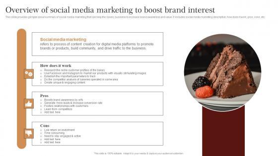 This slide provides glimpse about summary of social media marketing that can help the bakery business to increase brand awareness and value. It includes social media marketing description, how does it work, pros, cons, etc.The best PPT templates are a great way to save time, energy, and resources. Slidegeeks have 100Precent editable powerpoint slides making them incredibly versatile. With these quality presentation templates, you can create a captivating and memorable presentation by combining visually appealing slides and effectively communicating your message. Download Overview Of Social Media Marketing To Boost Interest Strategic Advertising Plan For Bakehouse Slides Pdf from Slidegeeks and deliver a wonderful presentation. This slide provides glimpse about summary of social media marketing that can help the bakery business to increase brand awareness and value. It includes social media marketing description, how does it work, pros, cons, etc.