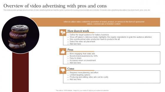 This slide provides glimpse about summary of video advertising that can help the bakery business for boosting brand visibility and credibility. It includes video advertising description, how does it work, pros, cons, etc.Are you searching for a Overview Of Video Advertising With Pros And Cons Strategic Advertising Plan For Bakehouse Clipart Pdf that is uncluttered, straightforward, and original Its easy to edit, and you can change the colors to suit your personal or business branding. For a presentation that expresses how much effort you have put in, this template is ideal. With all of its features, including tables, diagrams, statistics, and lists, its perfect for a business plan presentation. Make your ideas more appealing with these professional slides. Download Overview Of Video Advertising With Pros And Cons Strategic Advertising Plan For Bakehouse Clipart Pdf from Slidegeeks today. This slide provides glimpse about summary of video advertising that can help the bakery business for boosting brand visibility and credibility. It includes video advertising description, how does it work, pros, cons, etc.