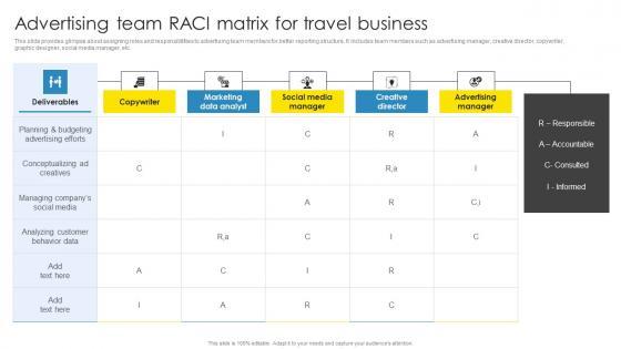 This slide provides glimpse about assigning roles and responsibilities to advertising team members for better reporting structure. It includes team members such as advertising manager, creative director, copywriter, graphic designer, social media manager, etc. Get a simple yet stunning designed Strategic Marketing Plan Addressing Different Travel Packages For Eco Tourism Introduction Pdf It is the best one to establish the tone in your meetings. It is an excellent way to make your presentations highly effective. So, download this PPT today from Slidegeeks and see the positive impacts. Our easy-to-edit Strategic Marketing Plan Addressing Different Travel Packages For Eco Tourism Introduction Pdf can be your go-to option for all upcoming conferences and meetings. So, what are you waiting for Grab this template today. This slide provides glimpse about assigning roles and responsibilities to advertising team members for better reporting structure. It includes team members such as advertising manager, creative director, copywriter, graphic designer, social media manager, etc.