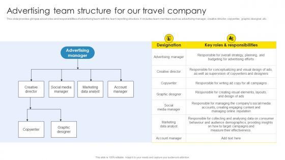 This slide provides glimpse about roles and responsibilities of advertising team with the team reporting structure. It includes team members such as advertising manager, creative director, copywriter, graphic designer, etc. From laying roadmaps to briefing everything in detail, our templates are perfect for you. You can set the stage with your presentation slides. All you have to do is download these easy-to-edit and customizable templates. Strategic Marketing Plan Addressing Different Travel Packages For Eco Tourism Introduction Pdf will help you deliver an outstanding performance that everyone would remember and praise you for. Do download this presentation today. This slide provides glimpse about roles and responsibilities of advertising team with the team reporting structure. It includes team members such as advertising manager, creative director, copywriter, graphic designer, etc.
