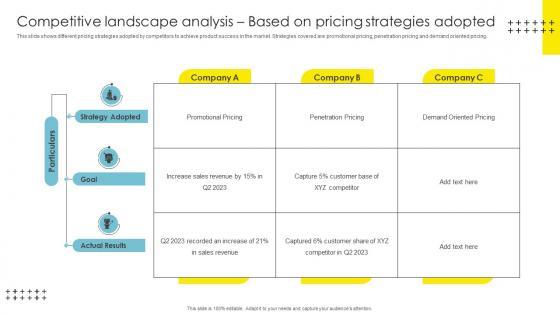 This slide shows different pricing strategies adopted by competitors to achieve product success in the market. Strategies covered are promotional pricing, penetration pricing and demand oriented pricing. Slidegeeks is here to make your presentations a breeze with Competitive Landscape Analysis Based On Strategic Brand Management Topics Pdf With our easy to use and customizable templates, you can focus on delivering your ideas rather than worrying about formatting. With a variety of designs to choose from, you are sure to find one that suits your needs. And with animations and unique photos, illustrations, and fonts, you can make your presentation pop. So whether you are giving a sales pitch or presenting to the board, make sure to check out Slidegeeks first. This slide shows different pricing strategies adopted by competitors to achieve product success in the market. Strategies covered are promotional pricing, penetration pricing and demand oriented pricing.