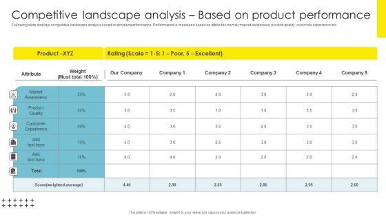 Following slide displays competitive landscape analysis based on product performance. Performance is measured based on attributes namely market awareness, product quality, customer experience etc. Whether you have daily or monthly meetings, a brilliant presentation is necessary. Competitive Landscape Analysis Strategic Brand Management Demonstration Pdf can be your best option for delivering a presentation. Represent everything in detail using Competitive Landscape Analysis Strategic Brand Management Demonstration Pdf and make yourself stand out in meetings. The template is versatile and follows a structure that will cater to your requirements. All the templates prepared by Slidegeeks are easy to download and edit. Our research experts have taken care of the corporate themes as well. So, give it a try and see the results. Following slide displays competitive landscape analysis based on product performance. Performance is measured based on attributes namely market awareness, product quality, customer experience etc.