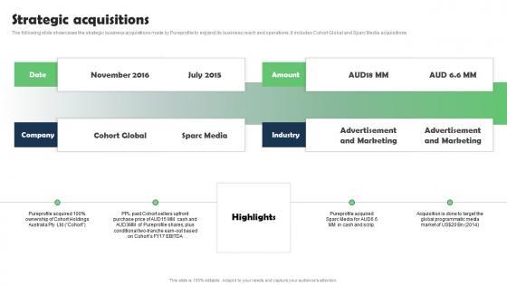 The following slide showcases the strategic business acquisitions made by Pureprofile to expand its business reach and operations. It includes Cohort Global and Sparc Media acquisitions. Do you know about Slidesgeeks Strategic Acquisitions Marketing Research Services Management Business Inspiration Pdf These are perfect for delivering any kind od presentation. Using it, create PowerPoint presentations that communicate your ideas and engage audiences. Save time and effort by using our pre-designed presentation templates that are perfect for a wide range of topic. Our vast selection of designs covers a range of styles, from creative to business, and are all highly customizable and easy to edit. Download as a PowerPoint template or use them as Google Slides themes. The following slide showcases the strategic business acquisitions made by Pureprofile to expand its business reach and operations. It includes Cohort Global and Sparc Media acquisitions.