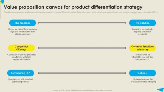 This slide showcases value proposition canvas that can help organization in product differentiation strategy. Its key elements are problem, solution, competitor offerings, common industry practices, features, formulating USP etc. Find highly impressive on Slidegeeks to deliver a meaningful presentation. You can save an ample amount of time using these presentation templates. No need to worry to prepare everything from scratch because Slidegeeks experts have already done a huge research and work for you. You need to download for your upcoming presentation. All the presentation templates are 100 percent editable and you can change the color and personalize the content accordingly. Download now This slide showcases value proposition canvas that can help organization in product differentiation strategy. Its key elements are problem, solution, competitor offerings, common industry practices, features, formulating USP etc.