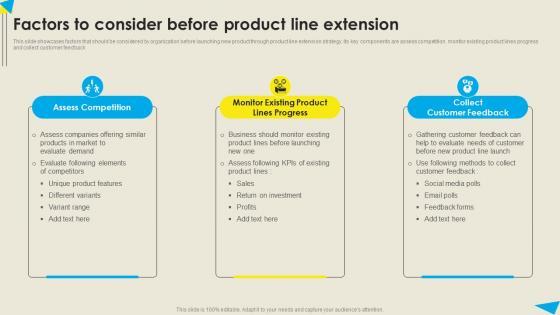 This slide showcases factors that should be considered by organization before launching new product through product line extension strategy. Its key components are assess competition. monitor existing product lines progress and collect customer feedback. Formulating a presentation can take up a lot of effort and time, so the content and message should always be the primary focus. The visuals of the PowerPoint can enhance the presenters message, so our Factors To Consider Before Product Line Extension Strategic Diversification Plan Portrait PDF was created to help save time. Instead of worrying about the design, the presenter can concentrate on the message while our designers work on creating the ideal templates for whatever situation is needed. Slidegeeks has experts for everything from amazing designs to valuable content, we have put everything into Factors To Consider Before Product Line Extension Strategic Diversification Plan Portrait PDF This slide showcases factors that should be considered by organization before launching new product through product line extension strategy. Its key components are assess competition. monitor existing product lines progress and collect customer feedback.