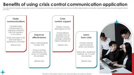 The slide outlines the importance of application used for communicating a crisis to the team and other stakeholders. Various benefits included are faster communication, improves effectiveness, crisis control support and learn from crisis Slidegeeks has constructed Benefits Using Crisis Control Strategic Guide Crisis Communication Planning Themes Pdf after conducting extensive research and examination. These presentation templates are constantly being generated and modified based on user preferences and critiques from editors. Here, you will find the most attractive templates for a range of purposes while taking into account ratings and remarks from users regarding the content. This is an excellent jumping off point to explore our content and will give new users an insight into our top notch PowerPoint Templates. The slide outlines the importance of application used for communicating a crisis to the team and other stakeholders. Various benefits included are faster communication, improves effectiveness, crisis control support and learn from crisis