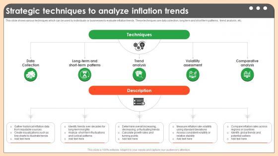This slide shows various techniques which can be used by individuals or businesses to evaluate inflation trends. These techniques are data collection, long term and short term patterns, trend analysis, etc. Slidegeeks is here to make your presentations a breeze with Strategic Techniques To Analyze Inflation Trends Comprehensive Guide On Inflation Control CM SS V With our easy-to-use and customizable templates, you can focus on delivering your ideas rather than worrying about formatting. With a variety of designs to choose from, you are sure to find one that suits your needs. And with animations and unique photos, illustrations, and fonts, you can make your presentation pop. So whether you are giving a sales pitch or presenting to the board, make sure to check out Slidegeeks first This slide shows various techniques which can be used by individuals or businesses to evaluate inflation trends. These techniques are data collection, long term and short term patterns, trend analysis, etc.