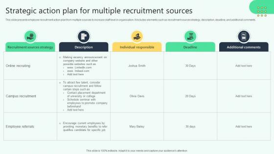 This slide presents employee recruitment action plan from multiple sources to increase staff level in organisation. It includes elements such as recruitment sources strategy, description, deadline, and additional comments. Get a simple yet stunning designed Strategic Action Plan For Multiple Recruitment Sources Analysing Hr Data For Effective Decision Making. It is the best one to establish the tone in your meetings. It is an excellent way to make your presentations highly effective. So, download this PPT today from Slidegeeks and see the positive impacts. Our easy-to-edit Strategic Action Plan For Multiple Recruitment Sources Analysing Hr Data For Effective Decision Making can be your go-to option for all upcoming conferences and meetings. So, what are you waiting for Grab this template today. This slide presents employee recruitment action plan from multiple sources to increase staff level in organisation. It includes elements such as recruitment sources strategy, description, deadline, and additional comments.