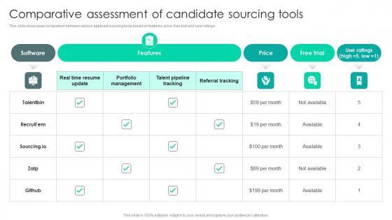 This slide showcases comparison between various applicant sourcing tools based on features, price, free trial and user ratings. If your project calls for a presentation, then Slidegeeks is your go-to partner because we have professionally designed, easy-to-edit templates that are perfect for any presentation. After downloading, you can easily edit Strategic Staffing Using Data Comparative Assessment Of Candidate Sourcing Tools CRP DK SS V and make the changes accordingly. You can rearrange slides or fill them with different images. Check out all the handy templates This slide showcases comparison between various applicant sourcing tools based on features, price, free trial and user ratings.