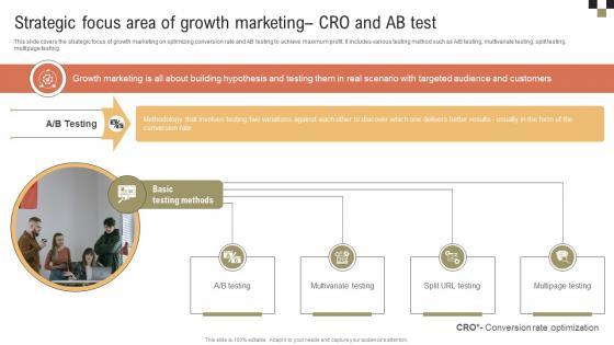 This slide covers the strategic focus of growth marketing on optimizing conversion rate and AB testing to achieve maximum profit. It includes various testing method such as A or B testing, multivariate testing, split testing, multipage testing. This A Comprehensive Approach To Strategic Focus Area Of Growth Marketing Cro And Ab MKT SS V is perfect for any presentation, be it in front of clients or colleagues. It is a versatile and stylish solution for organizing your meetings. The A Comprehensive Approach To Strategic Focus Area Of Growth Marketing Cro And Ab MKT SS V features a modern design for your presentation meetings. The adjustable and customizable slides provide unlimited possibilities for acing up your presentation. Slidegeeks has done all the homework before launching the product for you. So, do not wait, grab the presentation templates today This slide covers the strategic focus of growth marketing on optimizing conversion rate and AB testing to achieve maximum profit. It includes various testing method such as A or B testing, multivariate testing, split testing, multipage testing.