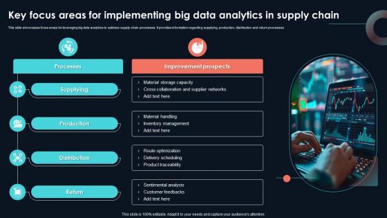 This slide showcases focus areas for leveraging big data analytics to optimize supply chain processes. It provides information regarding supplying, production, distribution and return processes. Present like a pro with Key Focus Areas For Implementing Big Data Developing Strategic Insights Using Big Data Analytics SS V. Create beautiful presentations together with your team, using our easy-to-use presentation slides. Share your ideas in real-time and make changes on the fly by downloading our templates. So whether you are in the office, on the go, or in a remote location, you can stay in sync with your team and present your ideas with confidence. With Slidegeeks presentation got a whole lot easier. Grab these presentations today. This slide showcases focus areas for leveraging big data analytics to optimize supply chain processes. It provides information regarding supplying, production, distribution and return processes.