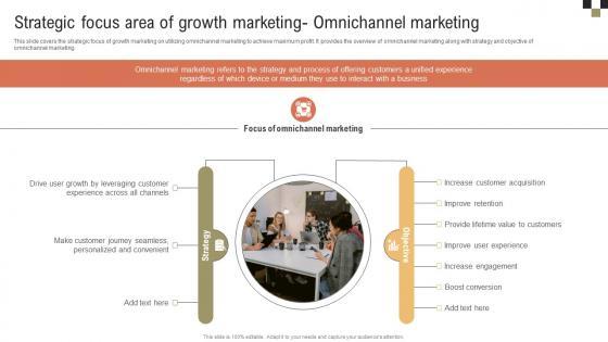 This slide covers the strategic focus of growth marketing on utilizing omnichannel marketing to achieve maximum profit. It provides the overview of omnichannel marketing along with strategy and objective of omnichannel marketing. Slidegeeks is here to make your presentations a breeze with A Comprehensive Approach To Growth Strategic Focus Area Of Growth Marketing MKT SS V With our easy-to-use and customizable templates, you can focus on delivering your ideas rather than worrying about formatting. With a variety of designs to choose from, you are sure to find one that suits your needs. And with animations and unique photos, illustrations, and fonts, you can make your presentation pop. So whether you are giving a sales pitch or presenting to the board, make sure to check out Slidegeeks first This slide covers the strategic focus of growth marketing on utilizing omnichannel marketing to achieve maximum profit. It provides the overview of omnichannel marketing along with strategy and objective of omnichannel marketing.