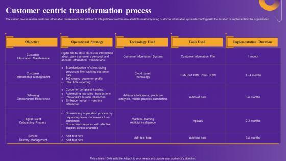 The centric processes like customer information maintenance that will lead to integration of customer related information by using customer information system technology with the duration to implement it in the organization. Get a simple yet stunning designed Customer Centric Transformation Strategic Framework To Improve Digital Transformation Portrait Pdf. It is the best one to establish the tone in your meetings. It is an excellent way to make your presentations highly effective. So, download this PPT today from Slidegeeks and see the positive impacts. Our easy to edit Customer Centric Transformation Strategic Framework To Improve Digital Transformation Portrait Pdf can be your go to option for all upcoming conferences and meetings. So, what are you waiting for Grab this template today. The centric processes like customer information maintenance that will lead to integration of customer related information by using customer information system technology with the duration to implement it in the organization.