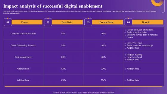 This slide depicts the impact of successful implementation of IT service Excellence in terms improved client onboarding process and customer satisfaction. It also depicts that how much the focus area has been improved from the previous state. Crafting an eye catching presentation has never been more straightforward. Let your presentation shine with this tasteful yet straightforward Impact Analysis Of Successful Strategic Framework To Improve Digital Transformation Portrait Pdf template. It offers a minimalistic and classy look that is great for making a statement. The colors have been employed intelligently to add a bit of playfulness while still remaining professional. Construct the ideal Impact Analysis Of Successful Strategic Framework To Improve Digital Transformation Portrait Pdf that effortlessly grabs the attention of your audience Begin now and be certain to wow your customers This slide depicts the impact of successful implementation of IT service Excellence in terms improved client onboarding process and customer satisfaction. It also depicts that how much the focus area has been improved from the previous state.