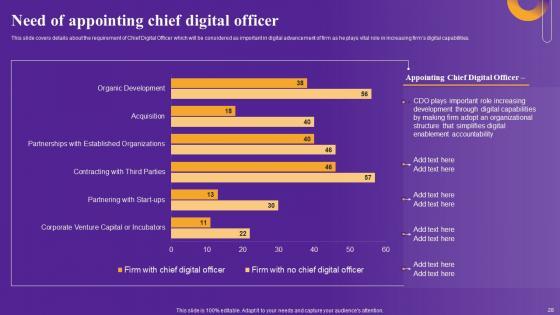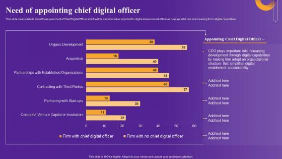 This slide covers details about the requirement of Chief Digital Officer which will be considered as important in digital advancement of firm as he plays vital role in increasing firms digital capabilities. Formulating a presentation can take up a lot of effort and time, so the content and message should always be the primary focus. The visuals of the PowerPoint can enhance the presenters message, so our Need Of Appointing Chief Digital Strategic Framework To Improve Digital Transformation Download Pdf was created to help save time. Instead of worrying about the design, the presenter can concentrate on the message while our designers work on creating the ideal templates for whatever situation is needed. Slidegeeks has experts for everything from amazing designs to valuable content, we have put everything into Need Of Appointing Chief Digital Strategic Framework To Improve Digital Transformation Download Pdf This slide covers details about the requirement of Chief Digital Officer which will be considered as important in digital advancement of firm as he plays vital role in increasing firms digital capabilities.