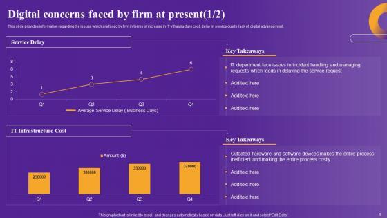This slide provides information regarding the issues which are faced by firm in terms of increase in IT infrastructure cost, delay in service due to lack of digital advancement. Present like a pro with Digital Concerns Faced Strategic Framework To Improve Digital Transformation Portrait Pdf Create beautiful presentations together with your team, using our easy to use presentation slides. Share your ideas in real time and make changes on the fly by downloading our templates. So whether you are in the office, on the go, or in a remote location, you can stay in sync with your team and present your ideas with confidence. With Slidegeeks presentation got a whole lot easier. Grab these presentations today. This slide provides information regarding the issues which are faced by firm in terms of increase in IT infrastructure cost, delay in service due to lack of digital advancement.