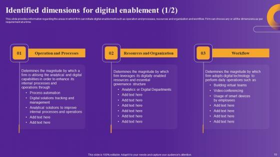 This slide provides information regarding the areas in which firm can initiate digital enablement such as operation and processes, resources and organization and workflow. Firm can choose any or all the dimensions as per requirement at a time. If you are looking for a format to display your unique thoughts, then the professionally designed Identified Dimensions For Digital Strategic Framework To Improve Digital Transformation Themes Pdf is the one for you. You can use it as a Google Slides template or a PowerPoint template. Incorporate impressive visuals, symbols, images, and other charts. Modify or reorganize the text boxes as you desire. Experiment with shade schemes and font pairings. Alter, share or cooperate with other people on your work. Download Identified Dimensions For Digital Strategic Framework To Improve Digital Transformation Themes Pdf and find out how to give a successful presentation. Present a perfect display to your team and make your presentation unforgettable. This slide provides information regarding the areas in which firm can initiate digital enablement such as operation and processes, resources and organization and workflow. Firm can choose any or all the dimensions as per requirement at a time.