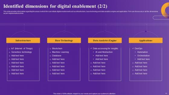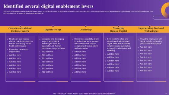 This slide provides information regarding the key levers associated in context to digital enablement such as customer centric, managing human capital, digital strategy, implementing tools and technologies, etc. Firm can choose any or all levers as per requirement at a time. Are you in need of a template that can accommodate all of your creative concepts This one is crafted professionally and can be altered to fit any style. Use it with Google Slides or PowerPoint. Include striking photographs, symbols, depictions, and other visuals. Fill, move around, or remove text boxes as desired. Test out color palettes and font mixtures. Edit and save your work, or work with colleagues. Download Identified Several Digital Strategic Framework To Improve Digital Transformation Sample Pdf and observe how to make your presentation outstanding. Give an impeccable presentation to your group and make your presentation unforgettable. This slide provides information regarding the key levers associated in context to digital enablement such as customer centric, managing human capital, digital strategy, implementing tools and technologies, etc. Firm can choose any or all levers as per requirement at a time.