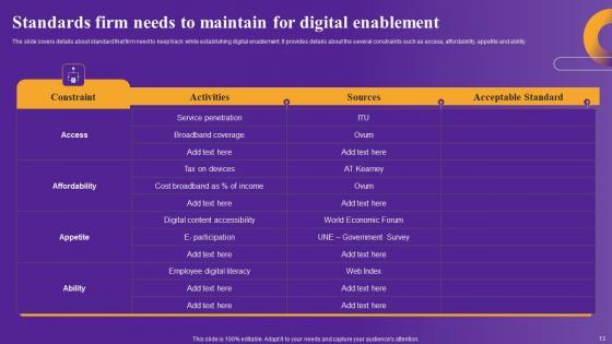 The slide covers details about standard that firm need to keep track while establishing digital enablement. It provides details about the several constraints such as access, affordability, appetite and ability. This Standards Firm Needs To Maintain Strategic Framework To Improve Digital Transformation Introduction Pdf is perfect for any presentation, be it in front of clients or colleagues. It is a versatile and stylish solution for organizing your meetings. The Standards Firm Needs To Maintain Strategic Framework To Improve Digital Transformation Introduction Pdf features a modern design for your presentation meetings. The adjustable and customizable slides provide unlimited possibilities for acing up your presentation. Slidegeeks has done all the homework before launching the product for you. So, do not wait, grab the presentation templates today The slide covers details about standard that firm need to keep track while establishing digital enablement. It provides details about the several constraints such as access, affordability, appetite and ability.