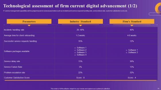 IT service management capabilities will be judged based on several parameters such as incidents and service requests handling rate, service failure rate, customer satisfaction score, etc. The best PPT templates are a great way to save time, energy, and resources. Slidegeeks have 100 percent editable powerpoint slides making them incredibly versatile. With these quality presentation templates, you can create a captivating and memorable presentation by combining visually appealing slides and effectively communicating your message. Download Technological Assessment Firm Strategic Framework To Improve Digital Transformation Clipart Pdf from Slidegeeks and deliver a wonderful presentation. IT service management capabilities will be judged based on several parameters such as incidents and service requests handling rate, service failure rate, customer satisfaction score, etc.