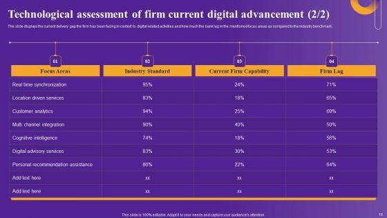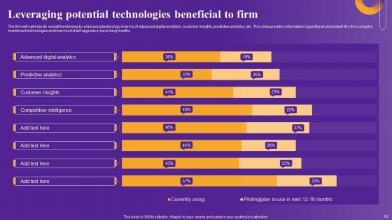 The firm will optimize its overall functioning by embracing technology in terms of advanced digital analytics, customer insights, predictive analytics, etc. This slide provides information regarding at what extent the firm using the mentioned technologies and how much it will upgrade in upcoming months. Make sure to capture your audiences attention in your business displays with our gratis customizable Leveraging Potential Technologies Strategic Framework To Improve Digital Transformation Brochure Pdf. These are great for business strategies, office conferences, capital raising or task suggestions. If you desire to acquire more customers for your tech business and ensure they stay satisfied, create your own sales presentation with these plain slides. The firm will optimize its overall functioning by embracing technology in terms of advanced digital analytics, customer insights, predictive analytics, etc. This slide provides information regarding at what extent the firm using the mentioned technologies and how much it will upgrade in upcoming months.