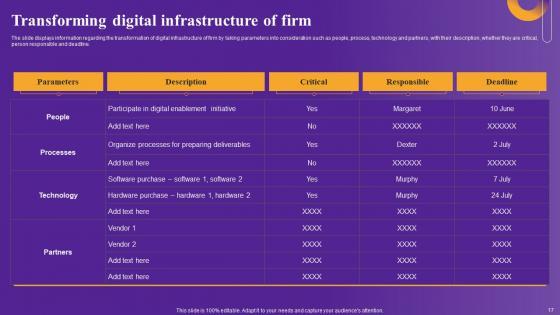 The slide displays information regarding the transformation of digital infrastructure of firm by taking parameters into consideration such as people, process, technology and partners, with their description, whether they are critical, person responsible and deadline. The Transforming Digital Infrastructure Strategic Framework To Improve Digital Transformation Topics Pdf is a compilation of the most recent design trends as a series of slides. It is suitable for any subject or industry presentation, containing attractive visuals and photo spots for businesses to clearly express their messages. This template contains a variety of slides for the user to input data, such as structures to contrast two elements, bullet points, and slides for written information. Slidegeeks is prepared to create an impression. The slide displays information regarding the transformation of digital infrastructure of firm by taking parameters into consideration such as people, process, technology and partners, with their description, whether they are critical, person responsible and deadline.