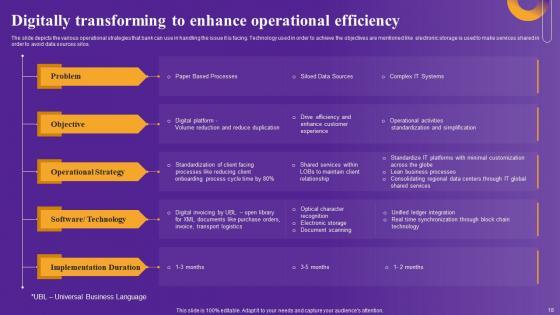 The slide depicts the various operational strategies that bank can use in handling the issue it is facing. Technology used in order to achieve the objectives are mentioned like electronic storage is used to make services shared in order to avoid data sources silos. Do you have an important presentation coming up Are you looking for something that will make your presentation stand out from the rest Look no further than Digitally Transforming To Enhance Strategic Framework To Improve Digital Transformation Rules Pdf. With our professional designs, you can trust that your presentation will pop and make delivering it a smooth process. And with Slidegeeks, you can trust that your presentation will be unique and memorable. So why wait Grab Digitally Transforming To Enhance Strategic Framework To Improve Digital Transformation Rules Pdf today and make your presentation stand out from the rest The slide depicts the various operational strategies that bank can use in handling the issue it is facing. Technology used in order to achieve the objectives are mentioned like electronic storage is used to make services shared in order to avoid data sources silos.