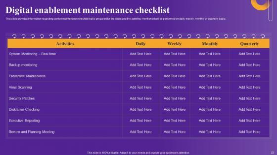 This slide provides information regarding service maintenance checklist that is prepared for the client and the activities mentioned will be performed on daily, weekly, monthly or quarterly basis. Slidegeeks is here to make your presentations a breeze with Digital Enablement Maintenance Strategic Framework To Improve Digital Transformation Structure Pdf With our easy to use and customizable templates, you can focus on delivering your ideas rather than worrying about formatting. With a variety of designs to choose from, you are sure to find one that suits your needs. And with animations and unique photos, illustrations, and fonts, you can make your presentation pop. So whether you are giving a sales pitch or presenting to the board, make sure to check out Slidegeeks first This slide provides information regarding service maintenance checklist that is prepared for the client and the activities mentioned will be performed on daily, weekly, monthly or quarterly basis.