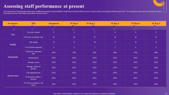 This slide helps in analyzing the performance of different executives representatives. It will help in tracking metrics such as cost per contact, percentage of tickets opened, etc. The staff performance will be assessed on various parameters such as cost, quality, productivity and service level. Slidegeeks is one of the best resources for PowerPoint templates. You can download easily and regulate Assessing Staff Performance Strategic Framework To Improve Digital Transformation Clipart Pdf for your personal presentations from our wonderful collection. A few clicks is all it takes to discover and get the most relevant and appropriate templates. Use our Templates to add a unique zing and appeal to your presentation and meetings. All the slides are easy to edit and you can use them even for advertisement purposes. This slide helps in analyzing the performance of different executives representatives. It will help in tracking metrics such as cost per contact, percentage of tickets opened, etc. The staff performance will be assessed on various parameters such as cost, quality, productivity and service level.