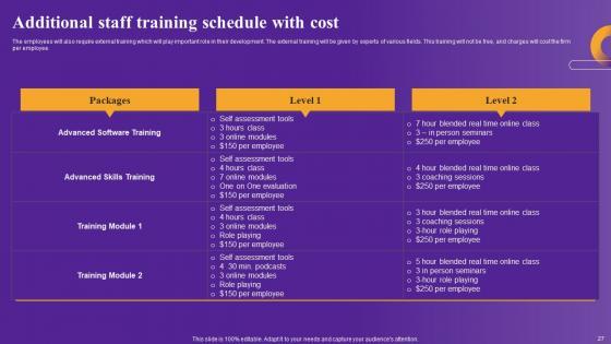 The employees will also require external training which will play important role in their development. The external training will be given by experts of various fields. This training will not be free, and charges will cost the firm per employee. Boost your pitch with our creative Additional Staff Training Strategic Framework To Improve Digital Transformation Themes Pdf. Deliver an awe inspiring pitch that will mesmerize everyone. Using these presentation templates you will surely catch everyones attention. You can browse the ppts collection on our website. We have researchers who are experts at creating the right content for the templates. So you do not have to invest time in any additional work. Just grab the template now and use them. The employees will also require external training which will play important role in their development. The external training will be given by experts of various fields. This training will not be free, and charges will cost the firm per employee.