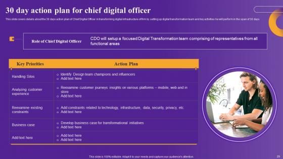 This slide covers details about the 30 days action plan of Chief Digital Officer in transforming digital infrastructure of firm by setting up digital transformation team and key activities he will perform in the span of 30 days. Find a pre designed and impeccable 30 Day Action Plan For Chief Strategic Framework To Improve Digital Transformation Diagrams Pdf. The templates can ace your presentation without additional effort. You can download these easy to edit presentation templates to make your presentation stand out from others. So, what are you waiting for Download the template from Slidegeeks today and give a unique touch to your presentation. This slide covers details about the 30 days action plan of Chief Digital Officer in transforming digital infrastructure of firm by setting up digital transformation team and key activities he will perform in the span of 30 days.