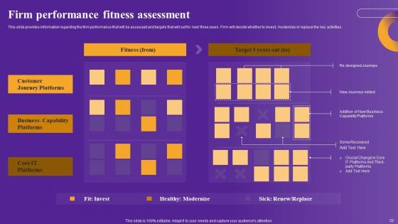 This slide provides information regarding the firm performance that will be assessed and targets that will set for next three years. Firm will decide whether to invest, modernize or replace the key activities. Whether you have daily or monthly meetings, a brilliant presentation is necessary. Firm Performance Fitness Strategic Framework To Improve Digital Transformation Template Pdf can be your best option for delivering a presentation. Represent everything in detail using Firm Performance Fitness Strategic Framework To Improve Digital Transformation Template Pdf and make yourself stand out in meetings. The template is versatile and follows a structure that will cater to your requirements. All the templates prepared by Slidegeeks are easy to download and edit. Our research experts have taken care of the corporate themes as well. So, give it a try and see the results. This slide provides information regarding the firm performance that will be assessed and targets that will set for next three years. Firm will decide whether to invest, modernize or replace the key activities.