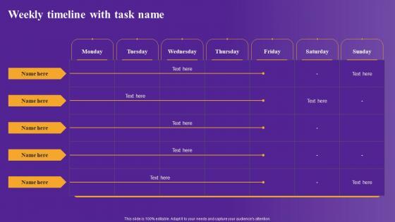 Retrieve professionally designed Weekly Timeline With Task Strategic Framework To Improve Digital Transformation Template Pdf to effectively convey your message and captivate your listeners. Save time by selecting pre made slideshows that are appropriate for various topics, from business to educational purposes. These themes come in many different styles, from creative to corporate, and all of them are easily adjustable and can be edited quickly. Access them as PowerPoint templates or as Google Slides themes. You do not have to go on a hunt for the perfect presentation because Slidegeeks got you covered from everywhere. Our Weekly Timeline With Task Strategic Framework To Improve Digital Transformation Template Pdf are topically designed to provide an attractive backdrop to any subject. Use them to look like a presentation pro.