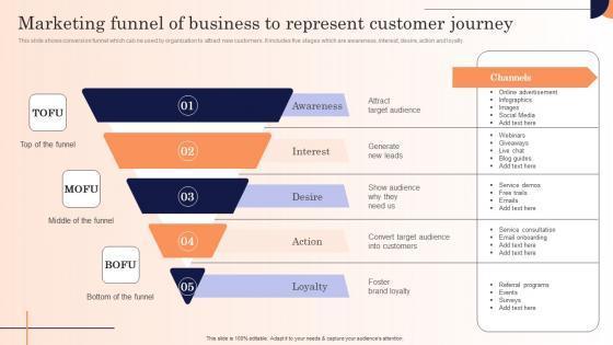 This slide shows conversion funnel which cab ne used by organization to attract new customers. It includes five stages which are awareness, interest, desire, action and loyalty.Are you searching for a Marketing Funnel Of Business To Represent Strategic Marketing Campaign Themes Pdf that is uncluttered, straightforward, and original Its easy to edit, and you can change the colors to suit your personal or business branding. For a presentation that expresses how much effort you have put in, this template is ideal. With all of its features, including tables, diagrams, statistics, and lists, its perfect for a business plan presentation. Make your ideas more appealing with these professional slides. Download Marketing Funnel Of Business To Represent Strategic Marketing Campaign Themes Pdf from Slidegeeks today. This slide shows conversion funnel which cab ne used by organization to attract new customers. It includes five stages which are awareness, interest, desire, action and loyalty.