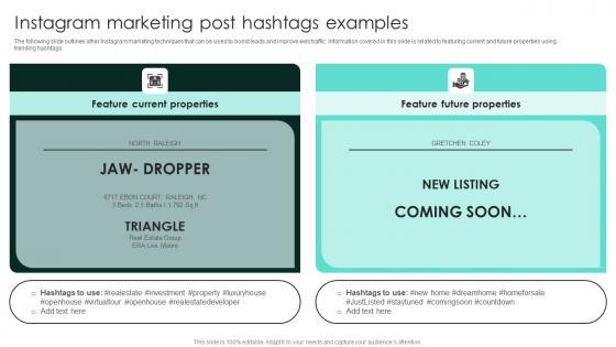 The following slide outlines other Instagram marketing techniques that can be used to boost leads and improve web traffic. Information covered in this slide is related to featuring current and future properties using. trending hashtags. Explore a selection of the finest Instagram Marketing Post Hashtags Examples Strategic Real Estate Information Pdf here. With a plethora of professionally designed and pre-made slide templates, you can quickly and easily find the right one for your upcoming presentation. You can use our Instagram Marketing Post Hashtags Examples Strategic Real Estate Information Pdf to effectively convey your message to a wider audience. Slidegeeks has done a lot of research before preparing these presentation templates. The content can be personalized and the slides are highly editable. Grab templates today from Slidegeeks. The following slide outlines other Instagram marketing techniques that can be used to boost leads and improve web traffic. Information covered in this slide is related to featuring current and future properties using. trending hashtags.