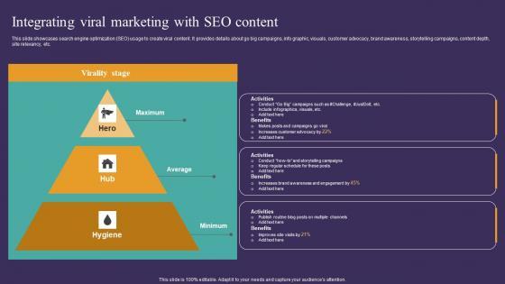 This slide showcases search engine optimization SEO usage to create viral content. It provides details about go big campaigns, info graphic, visuals, customer advocacy, brand awareness, storytelling campaigns, content depth, site relevancy, etc. Crafting an eye-catching presentation has never been more straightforward. Let your presentation shine with this tasteful yet straightforward Strategic Guide To Attract Integrating Viral Marketing With Seo Content Designs Pdf template. It offers a minimalistic and classy look that is great for making a statement. The colors have been employed intelligently to add a bit of playfulness while still remaining professional. Construct the ideal Strategic Guide To Attract Integrating Viral Marketing With Seo Content Designs Pdf that effortlessly grabs the attention of your audience. Begin now and be certain to wow your customers. This slide showcases search engine optimization SEO usage to create viral content. It provides details about go big campaigns, info graphic, visuals, customer advocacy, brand awareness, storytelling campaigns, content depth, site relevancy, etc.