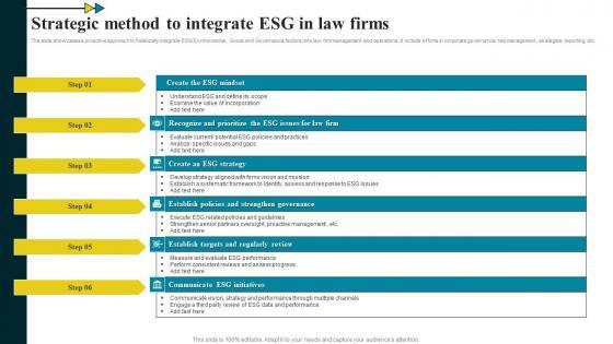 The slide showcases a proactive approach to holistically integrate ESG Environmental, Social and Governance factors into law firm management and operations. It include efforts in corporate governance, risk management, strategies, reporting, etc. Pitch your topic with ease and precision using this Strategic Method To Integrate ESG In Law Firms Guidelines Pdf This layout presents information on Recognize And Prioritize, Establish Policies, Strengthen Governance It is also available for immediate download and adjustment. So, changes can be made in the color, design, graphics or any other component to create a unique layout. The slide showcases a proactive approach to holistically integrate ESG Environmental, Social and Governance factors into law firm management and operations. It include efforts in corporate governance, risk management, strategies, reporting, etc.