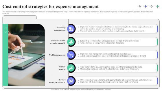 This slide represents cost management strategies for restaurant business that helps owner keep a healthy ratio between expenses and finances. It covers details regarding inventory management, purchase of raw material on credit, etc. Want to ace your presentation in front of a live audience Our Cost Control Strategies For Expense Management Strategic Guide To Launching Ppt Template can help you do that by engaging all the users towards you. Slidegeeks experts have put their efforts and expertise into creating these impeccable powerpoint presentations so that you can communicate your ideas clearly. Moreover, all the templates are customizable, and easy-to-edit and downloadable. Use these for both personal and commercial use. This slide represents cost management strategies for restaurant business that helps owner keep a healthy ratio between expenses and finances. It covers details regarding inventory management, purchase of raw material on credit, etc.