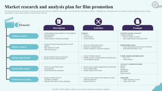 This slide showcases key elements of market research and analysis for different movie genre to develop effective marketing campaign. It highlights key components such as audience analysis, industry analysis, market segmentation, social media analysis and performance tracking. Retrieve professionally designed Market Research And Analysis Plan Strategic Plan To Increase Film Ppt Sample Strategy SS V to effectively convey your message and captivate your listeners. Save time by selecting pre-made slideshows that are appropriate for various topics, from business to educational purposes. These themes come in many different styles, from creative to corporate, and all of them are easily adjustable and can be edited quickly. Access them as PowerPoint templates or as Google Slides themes. You do not have to go on a hunt for the perfect presentation because Slidegeeks got you covered from everywhere. This slide showcases key elements of market research and analysis for different movie genre to develop effective marketing campaign. It highlights key components such as audience analysis, industry analysis, market segmentation, social media analysis and performance tracking.