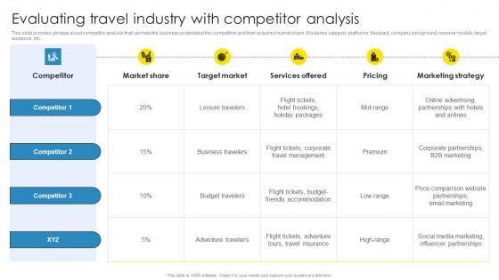 This slide provides glimpse about competitor analysis that can help the business understand the competition and their acquired market share. It includes category, platforms, freepaid, company background, revenue models, target audience, etc. Make sure to capture your audiences attention in your business displays with our gratis customizable Strategic Marketing Plan Evaluating Travel Industry With Competitor Analysis Guidelines Pdf These are great for business strategies, office conferences, capital raising or task suggestions. If you desire to acquire more customers for your tech business and ensure they stay satisfied, create your own sales presentation with these plain slides. This slide provides glimpse about competitor analysis that can help the business understand the competition and their acquired market share. It includes category, platforms, freepaid, company background, revenue models, target audience, etc.