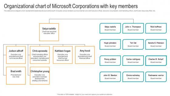 This slides shows diagram which represents the leadership structure at Microsoft. It includes various members such as chairman and chief executive officer, executive vice president, chief marketing officer, chief human resources officer, etc. This Organizational Chart Of Microsoft Corporations With Strategic Advancements By Microsofts Structure Pdf from Slidegeeks makes it easy to present information on your topic with precision. It provides customization options, so you can make changes to the colors, design, graphics, or any other component to create a unique layout. It is also available for immediate download, so you can begin using it right away. Slidegeeks has done good research to ensure that you have everything you need to make your presentation stand out. Make a name out there for a brilliant performance. This slides shows diagram which represents the leadership structure at Microsoft. It includes various members such as chairman and chief executive officer, executive vice president, chief marketing officer, chief human resources officer, etc.