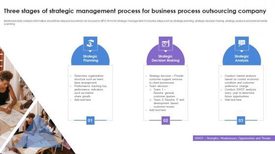 Mentioned slide contains information about three step process which can be used by BPO firms for strategic management. It includes steps such as strategic planning, strategic decision making, strategic analysis and environmental scanning. Pitch your topic with ease and precision using this Three Stages Of Strategic Management Process For Business Process Outsourcing Company Portrait Pdf. This layout presents information on Strategic Planning, Strategic Decision Making, Strategic Analysis. It is also available for immediate download and adjustment. So, changes can be made in the color, design, graphics or any other component to create a unique layout. Mentioned slide contains information about three step process which can be used by BPO firms for strategic management. It includes steps such as strategic planning, strategic decision making, strategic analysis and environmental scanning.