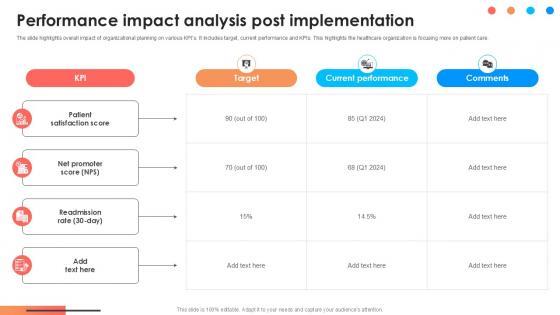 The slide highlights overall impact of organizational planning on various KPIs. It includes target, current performance and KPIs. This highlights the healthcare organization is focusing more on patient care. Find highly impressive Performance Impact Analysis Post Comprehensive Approach To Strategic Planning Ppt Powerpoint on Slidegeeks to deliver a meaningful presentation. You can save an ample amount of time using these presentation templates. No need to worry to prepare everything from scratch because Slidegeeks experts have already done a huge research and work for you. You need to download Performance Impact Analysis Post Comprehensive Approach To Strategic Planning Ppt Powerpoint for your upcoming presentation. All the presentation templates are 100 percent editable and you can change the color and personalize the content accordingly. Download now The slide highlights overall impact of organizational planning on various KPIs. It includes target, current performance and KPIs. This highlights the healthcare organization is focusing more on patient care.