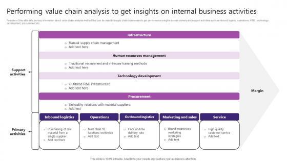 Purpose of this slide is to portray information about value chain analysis method that can be used by supply chain businesses to get performance insights across primary and support activities such as inbound logistic, operations, HRM, technology development, procurement etc. Slidegeeks is one of the best resources for PowerPoint templates. You can download easily and regulate Performing Value Chain Analysis To Get Insights Strategic Plan For Enhancing Mockup Pdf for your personal presentations from our wonderful collection. A few clicks is all it takes to discover and get the most relevant and appropriate templates. Use our Templates to add a unique zing and appeal to your presentation and meetings. All the slides are easy to edit and you can use them even for advertisement purposes. Purpose of this slide is to portray information about value chain analysis method that can be used by supply chain businesses to get performance insights across primary and support activities such as inbound logistic, operations, HRM, technology development, procurement etc.