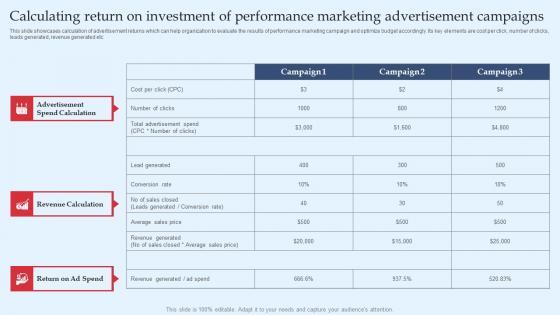 This slide showcases calculation of advertisement returns which can help organization to evaluate the results of performance marketing campaign and optimize budget accordingly. Its key elements are cost per click, number of clicks, leads generated, revenue generated etc. Whether you have daily or monthly meetings, a brilliant presentation is necessary. Strategic Performance Marketing Campaign Calculating Return On Investment Download Pdf can be your best option for delivering a presentation. Represent everything in detail using Strategic Performance Marketing Campaign Calculating Return On Investment Download Pdf and make yourself stand out in meetings. The template is versatile and follows a structure that will cater to your requirements. All the templates prepared by Slidegeeks are easy to download and edit. Our research experts have taken care of the corporate themes as well. So, give it a try and see the results. This slide showcases calculation of advertisement returns which can help organization to evaluate the results of performance marketing campaign and optimize budget accordingly. Its key elements are cost per click, number of clicks, leads generated, revenue generated etc.