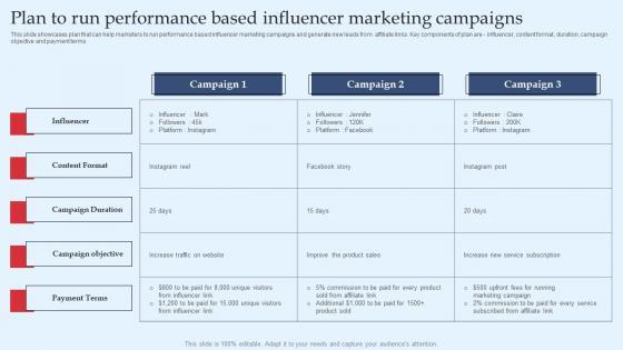 This slide showcases plan that can help marketers to run performance based influencer marketing campaigns and generate new leads from affiliate links. Key components of plan are influencer, content format, duration, campaign objective and payment terms. Create an editable Strategic Performance Marketing Campaign Plan To Run Performance Based Structure Pdf that communicates your idea and engages your audience. Whether you are presenting a business or an educational presentation, pre-designed presentation templates help save time. Strategic Performance Marketing Campaign Plan To Run Performance Based Structure Pdf is highly customizable and very easy to edit, covering many different styles from creative to business presentations. Slidegeeks has creative team members who have crafted amazing templates. So, go and get them without any delay. This slide showcases plan that can help marketers to run performance based influencer marketing campaigns and generate new leads from affiliate links. Key components of plan are influencer, content format, duration, campaign objective and payment terms.